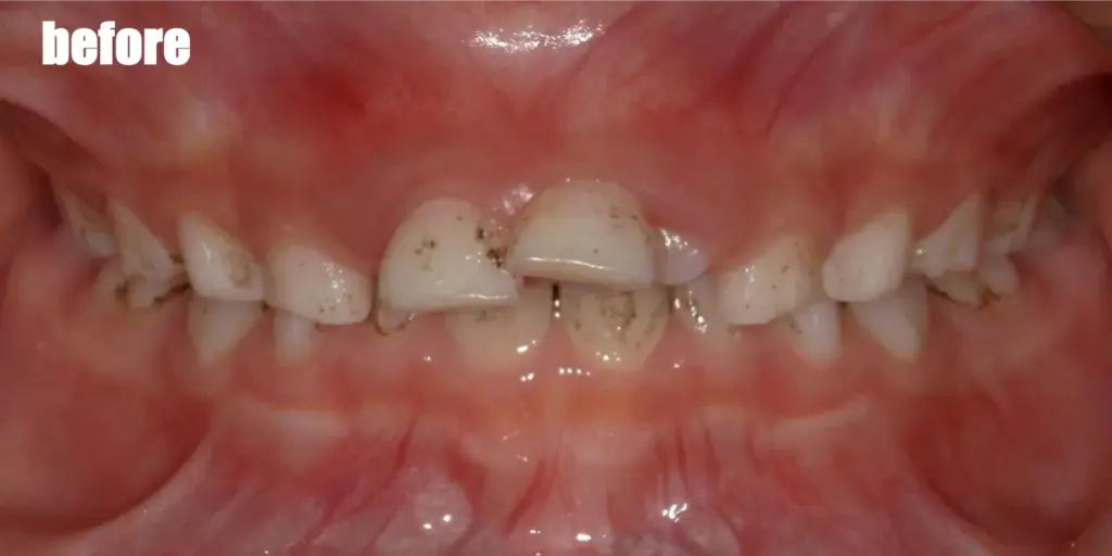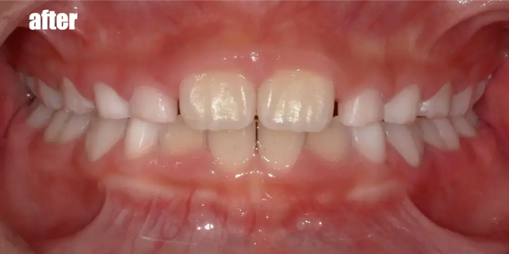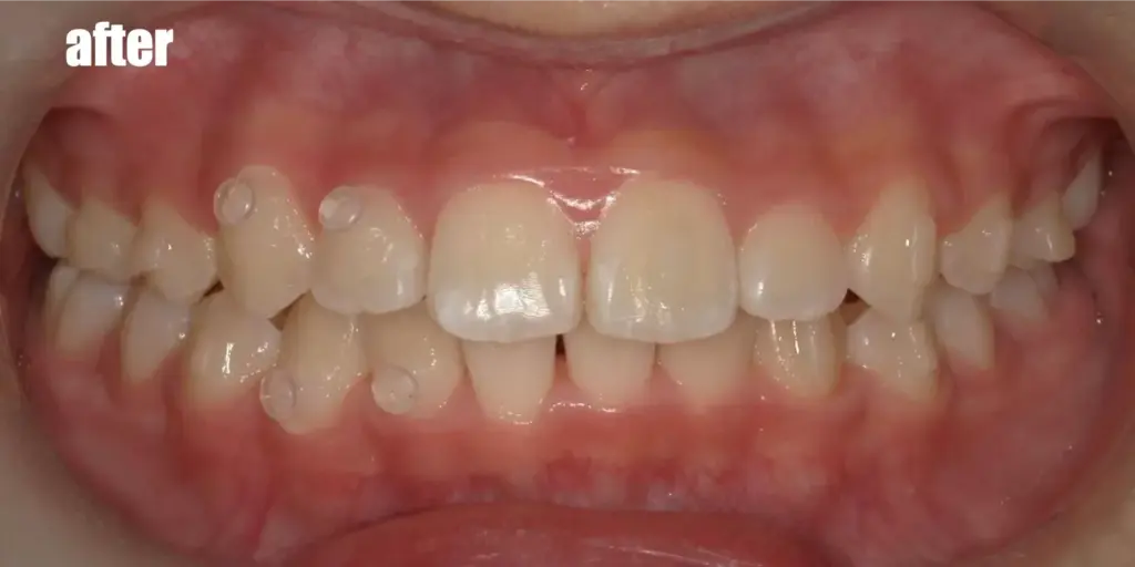 顎が小さく、大人の歯が十分に生えてくることができるスペースが足りていなかったため八重歯になってしまっていましたが、急速拡大装置(顎顔面矯正)をしっかり使って顎を大きくすることで、約1年程度でも劇的に歯並びが綺麗になりました!最近顎の小さいお子さんが増えており、八重歯やガタガタ前歯のお子さんが多いですが、適切な時期に顎を大きくしてあげることで、歯を抜かずに治すことが可能です!
